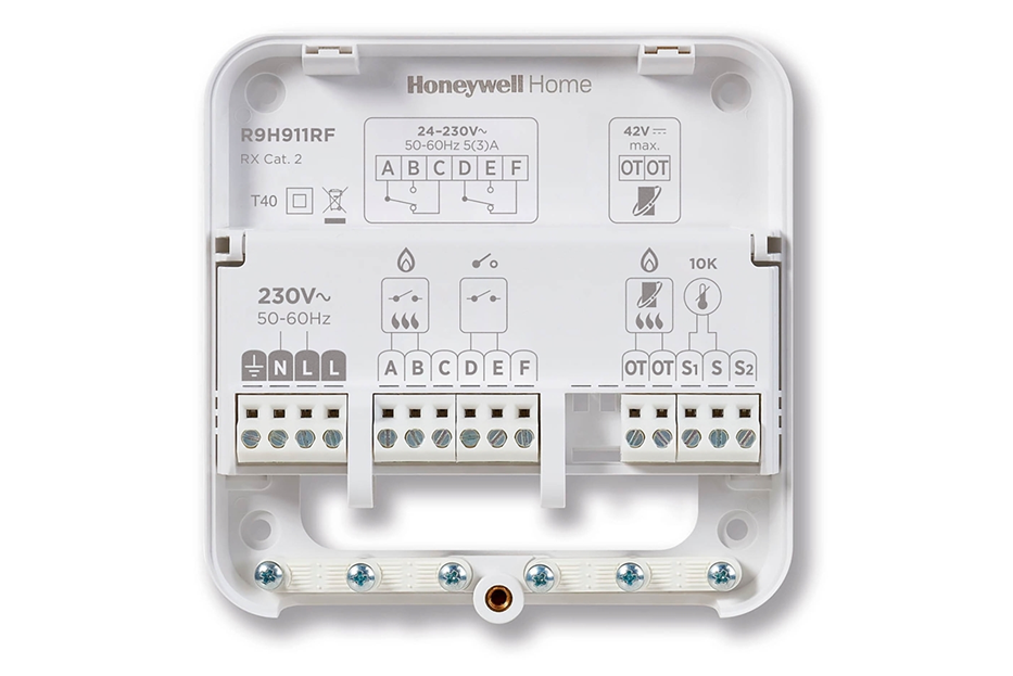 Honeywell Home R9H is een draadloze regelmodule met 3 aansturingen en een modern ergonomisch ontwerp met montagemogelijkheden voor rechtstreeks op de muur of op een inbouwdoos. Bekabeling is mogelijk vanaf de onderkant of achterkant door de klemmenstrook op te tillen, waardoor de installatie snel, ruim en gemakkelijk uitvoerbaar is.