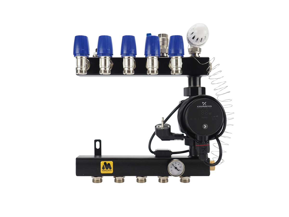 De verdeler is standaard uitgerust met een energiezuinige Grundfos ALPHA1-circulatiepomp.