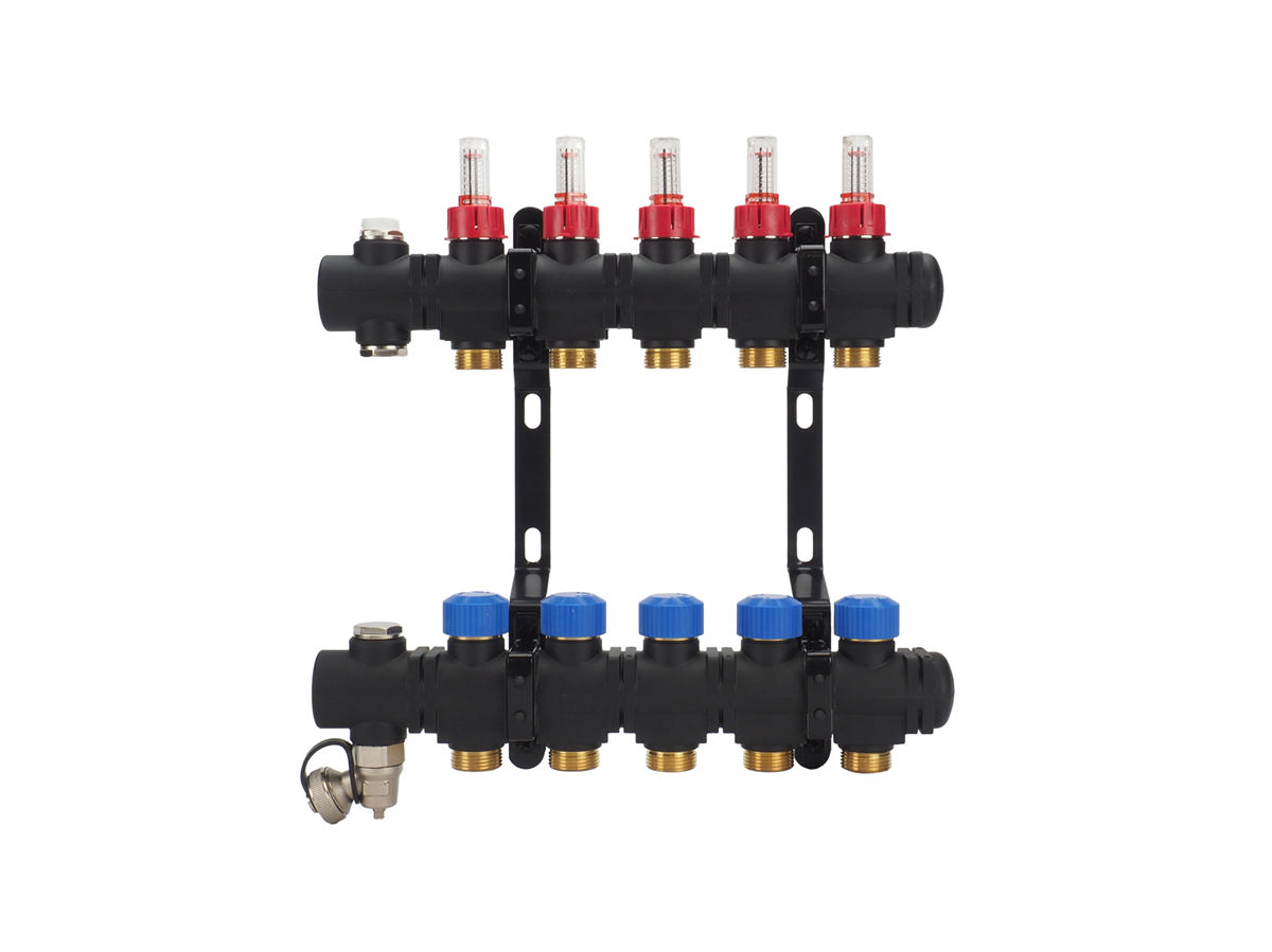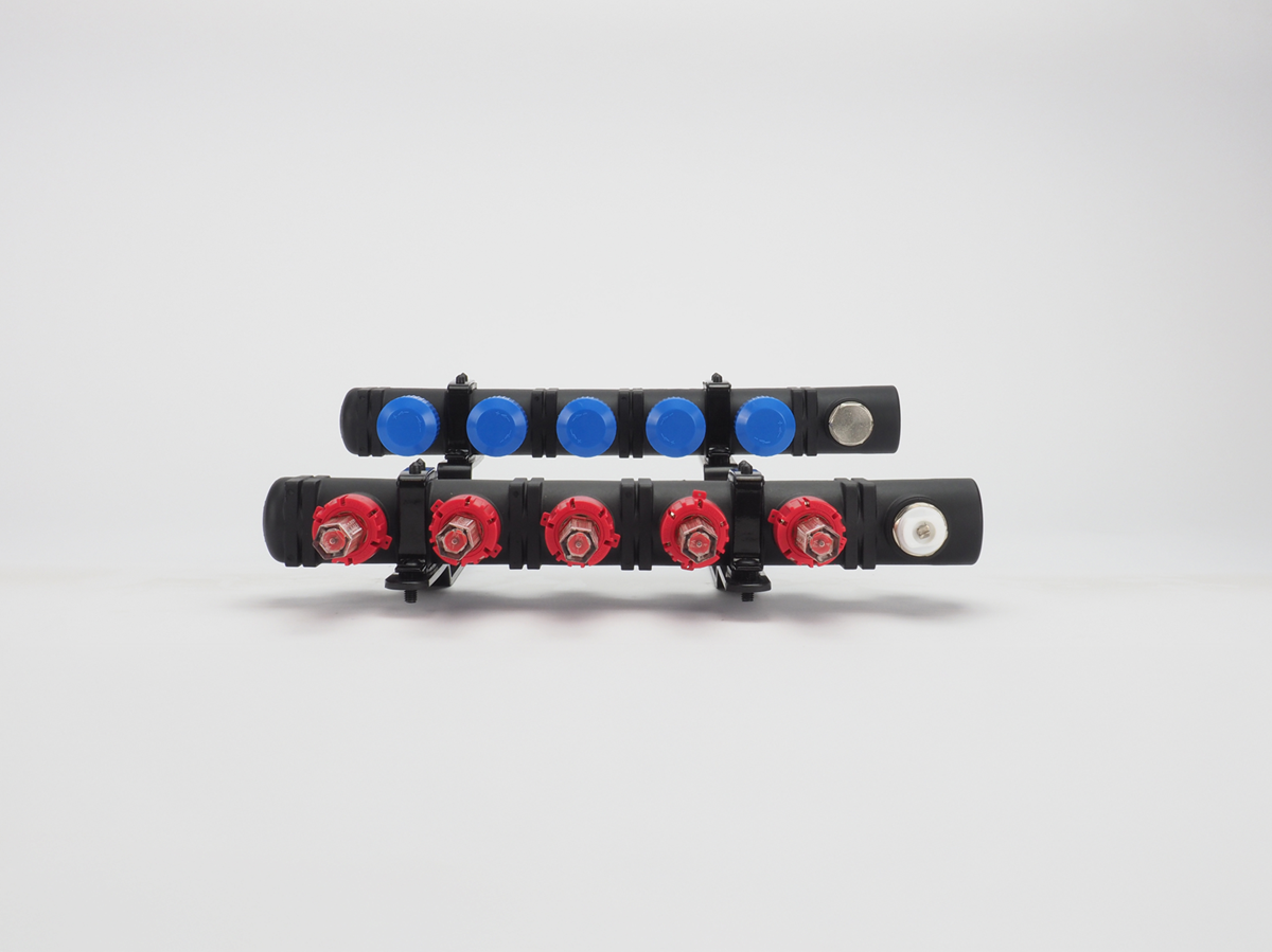 Deze uitvoering van de MAGNUM EcoFlow open kunststof verdeler bestaat uit een kunststof module uit één geheel. Deze module is vervaardigd van een met glasvezel versterkte polyamide, waardoor hij bestand is tegen zowel hoge als lage temperaturen. Dit maakt deze verdeelunit uitermate geschikt voor zowel verwarmen als koelen, bijvoorbeeld in combinatie met een hybride warmtepomp die in de winter warmte levert en in de zomer koelt. Standaard is deze basis uitvoering voorzien van een handmatige ontluchter en inregelbare flowmeters.