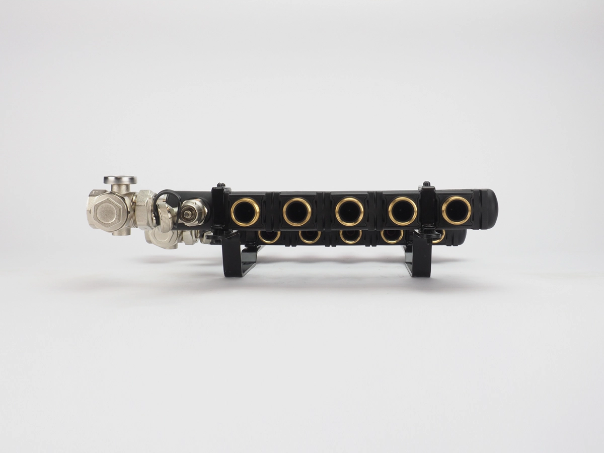 Sterke kunststof vloerverwarming verdeler opgebouwd uit voorgevormde kunststof elementen;