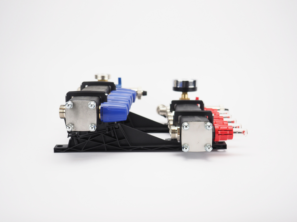 Sterke kunststof verdeler van losse componenten met flow-meters inbegrepen;
