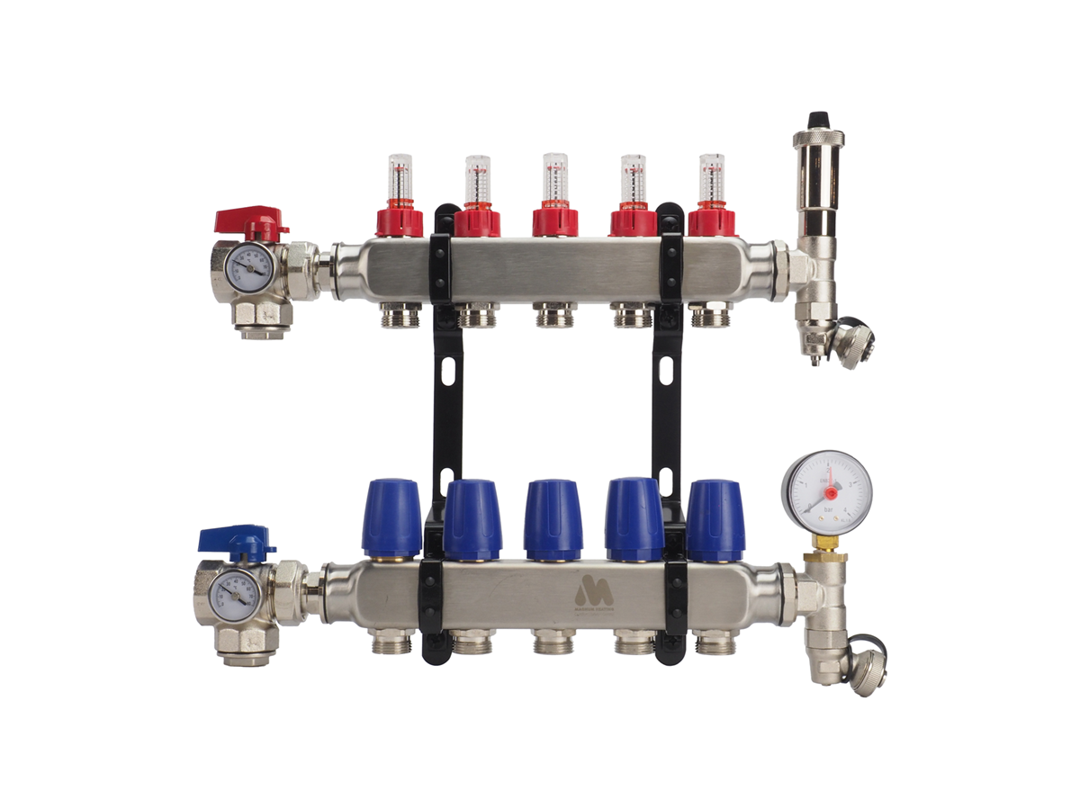Dit type verdeler kan geschikt gemaakt worden voor verwarmingssystemen met hogere aanvoertemperaturen vanaf 50°C door middel van de temperatuurregelaar.