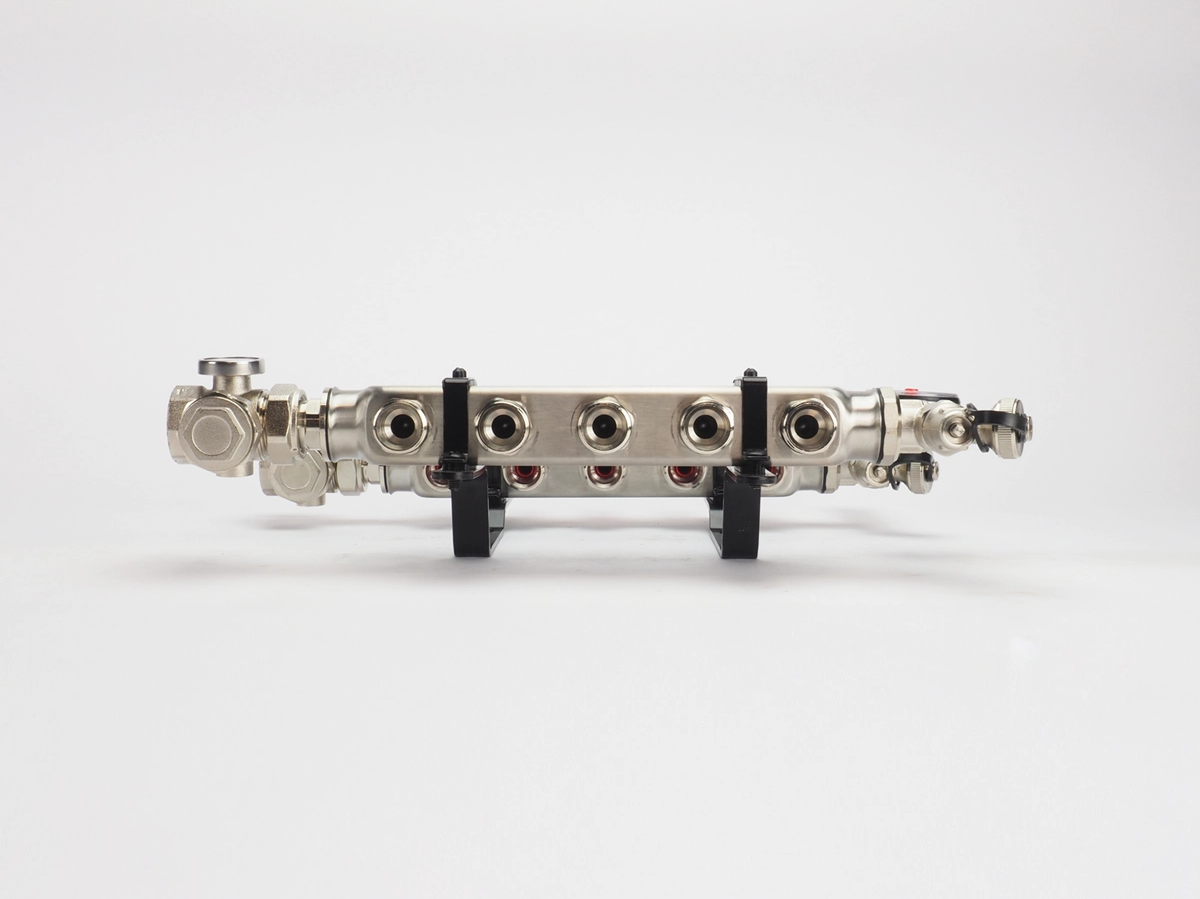 Dit type verdeler kan geschikt gemaakt worden voor verwarmingssystemen met hogere aanvoertemperaturen vanaf 50°C door middel van de temperatuurregelaar.