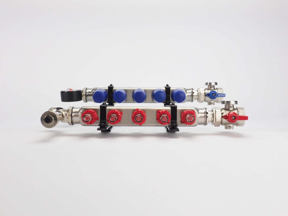 Dit type verdeler kan geschikt gemaakt worden voor verwarmingssystemen met hogere aanvoertemperaturen vanaf 50°C door middel van de temperatuurregelaar.