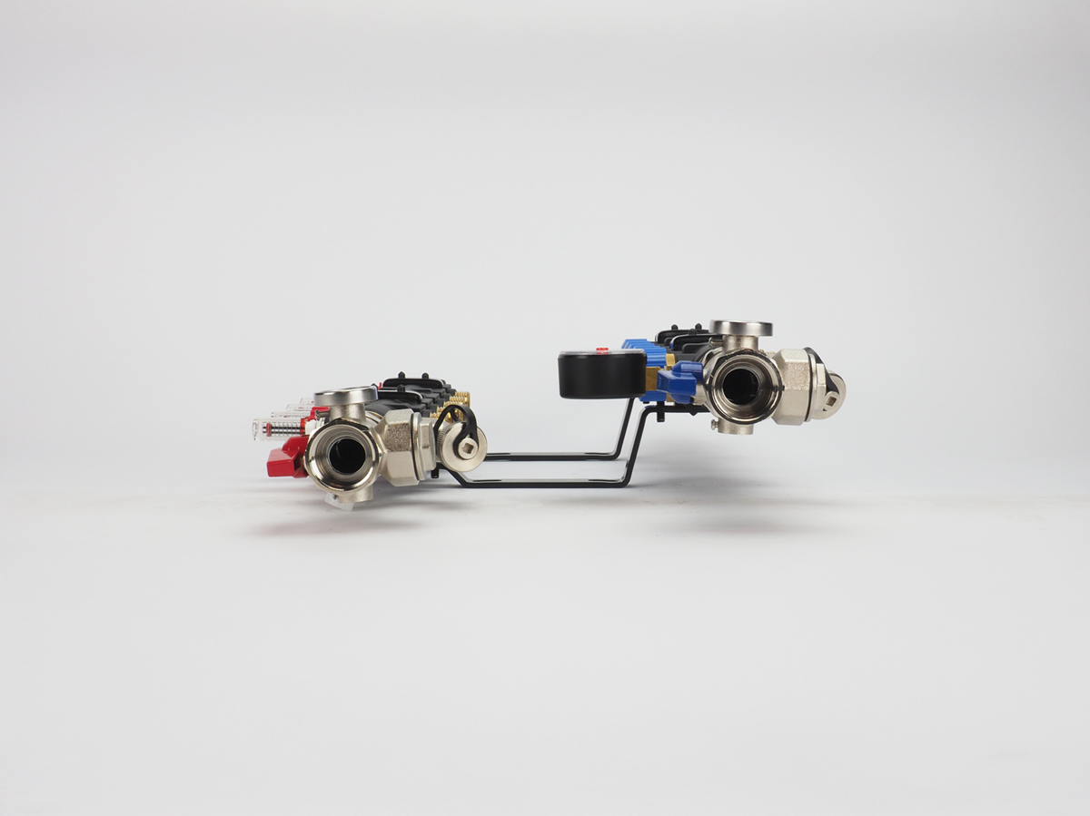 vul-/aftapkraan aanvoer met kogelafsluiter, 1" thermometer aanvoer handmatige ontluchter inregelbare flowmeter aanvoer vloerverwarmingsbuizen retour met kogelafsluiter, 1" thermometer retour vul-/aftapkraan manometer thermostatische afsluiter met M30 draad retour vloerverwarmingsbuizen |