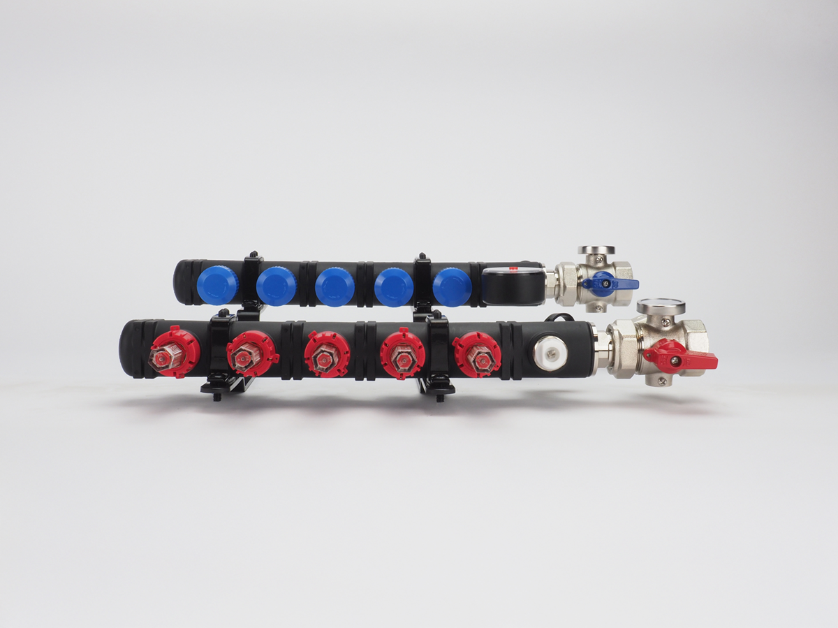 De MAGNUM EcoFlow open kunststof verdeler bestaat uit een kunststof module uit één geheel. Deze module is vervaardigd van een met glasvezel versterkte polyamide, waardoor hij bestand is tegen zowel hoge als lage temperaturen. Dit maakt deze verdeelunit uitermate geschikt voor zowel verwarmen als koelen, bijvoorbeeld in combinatie met een hybride warmtepomp die in de winter warmte levert en in de zomer koelt. Standaard is deze verdeler voorzien van 1” kogelkranen, een handmatige ontluchter en inregelbare flowmeters.