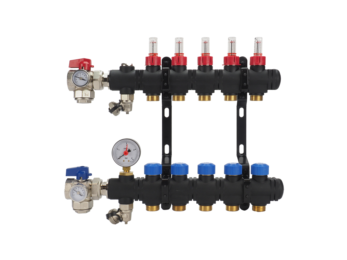 De MAGNUM EcoFlow open kunststof verdeler bestaat uit een kunststof module uit één geheel. Deze module is vervaardigd van een met glasvezel versterkte polyamide, waardoor hij bestand is tegen zowel hoge als lage temperaturen. Dit maakt deze verdeelunit uitermate geschikt voor zowel verwarmen als koelen, bijvoorbeeld in combinatie met een hybride warmtepomp die in de winter warmte levert en in de zomer koelt. Standaard is deze verdeler voorzien van 1” kogelkranen, een handmatige ontluchter en inregelbare flowmeters.