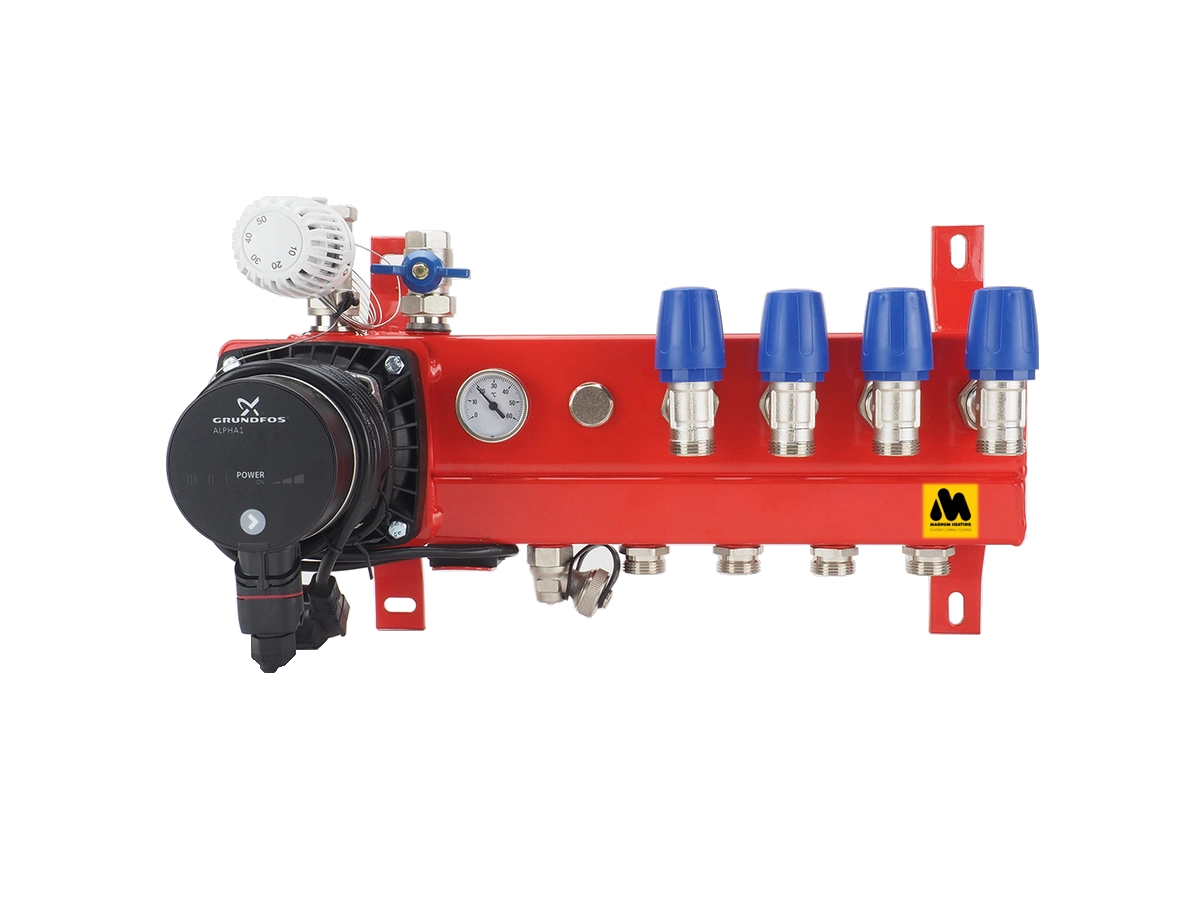 De verdeler is standaard uitgerust met een energiezuinige Grundfos ALPHA1 pomp.